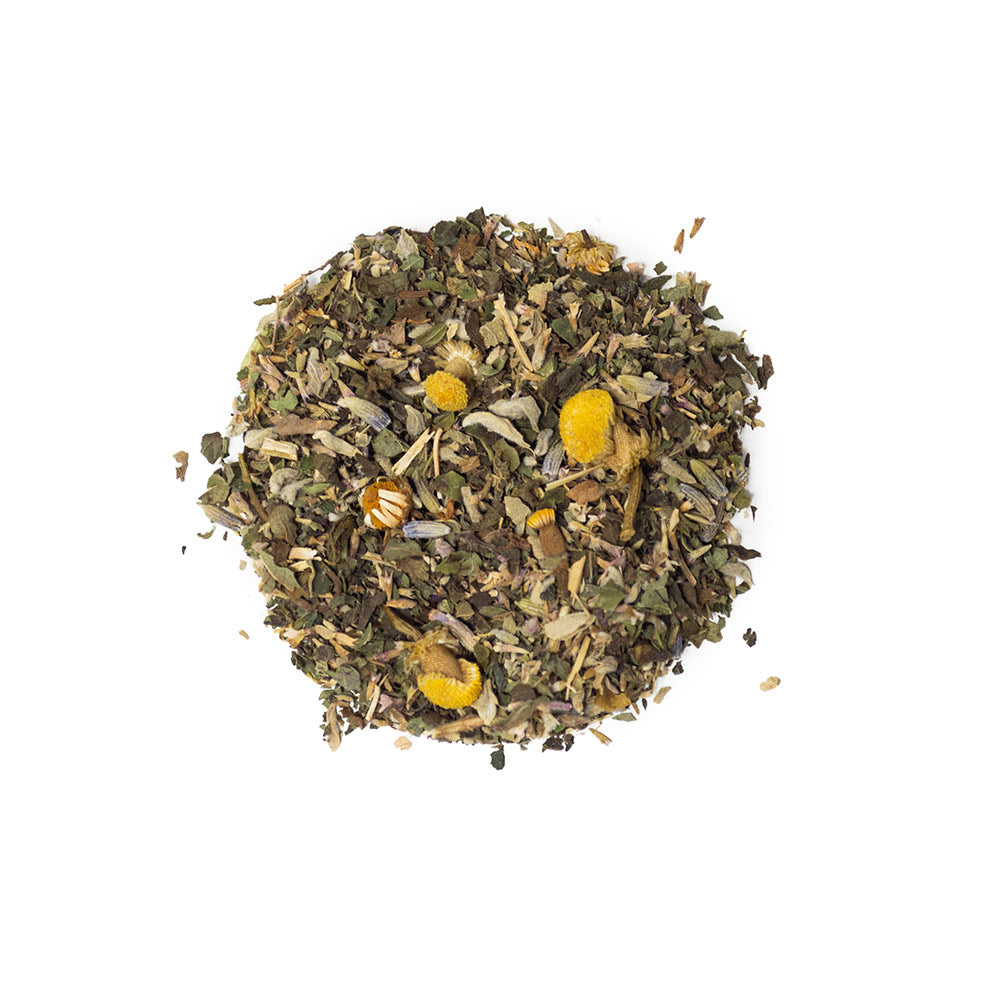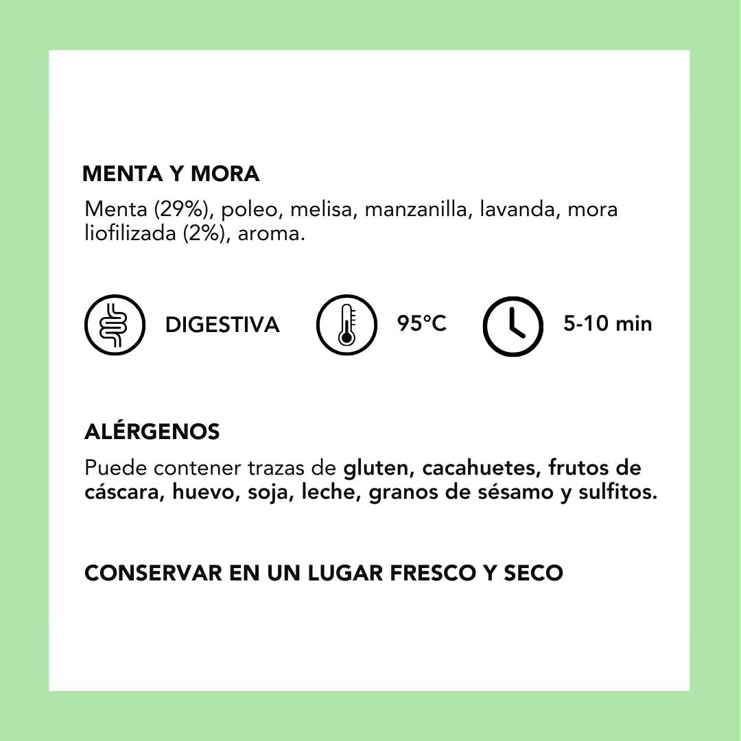 Menthe, menthe pouliot, mélisse, camomille, lavande, mûre lyophilisée, arôme.